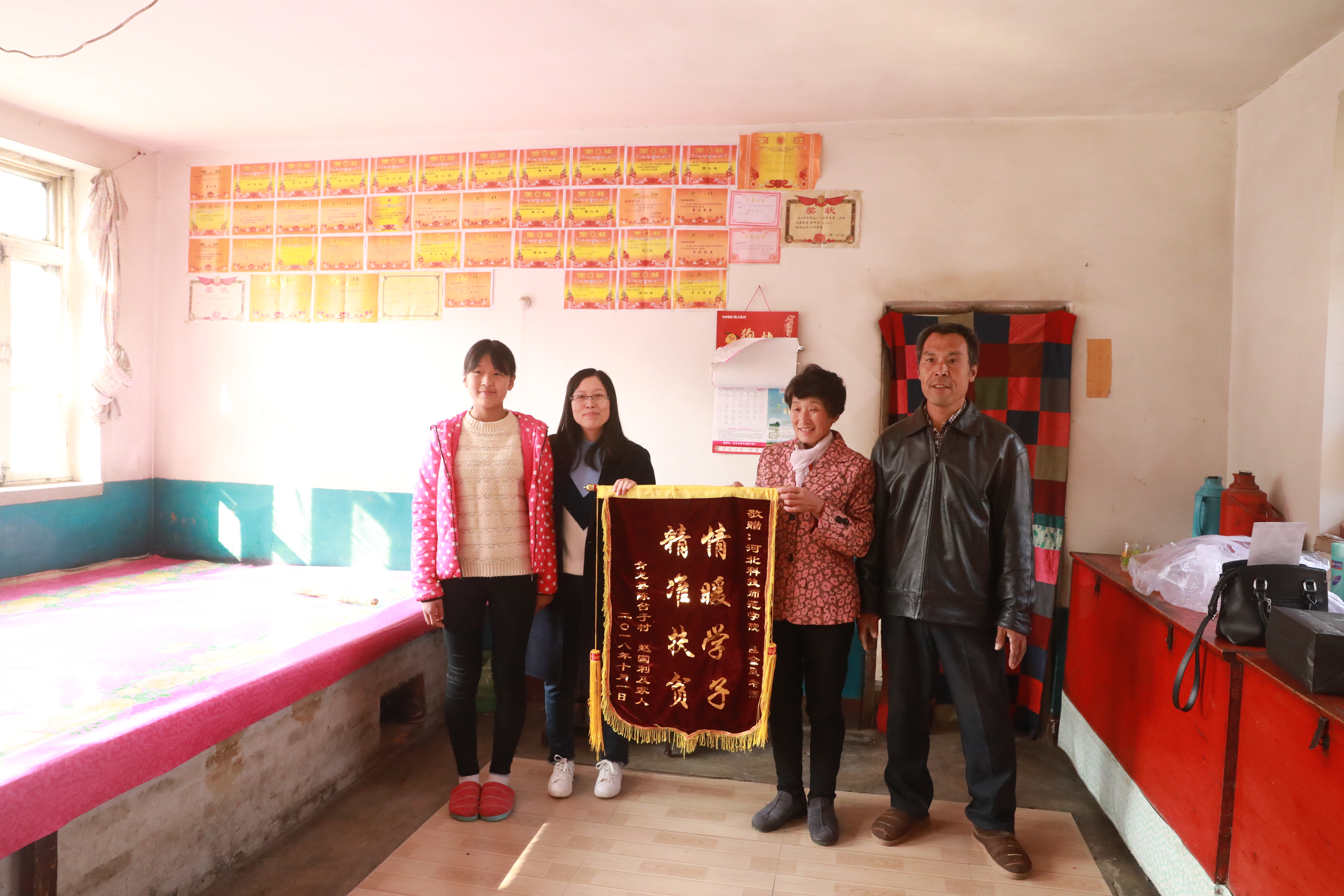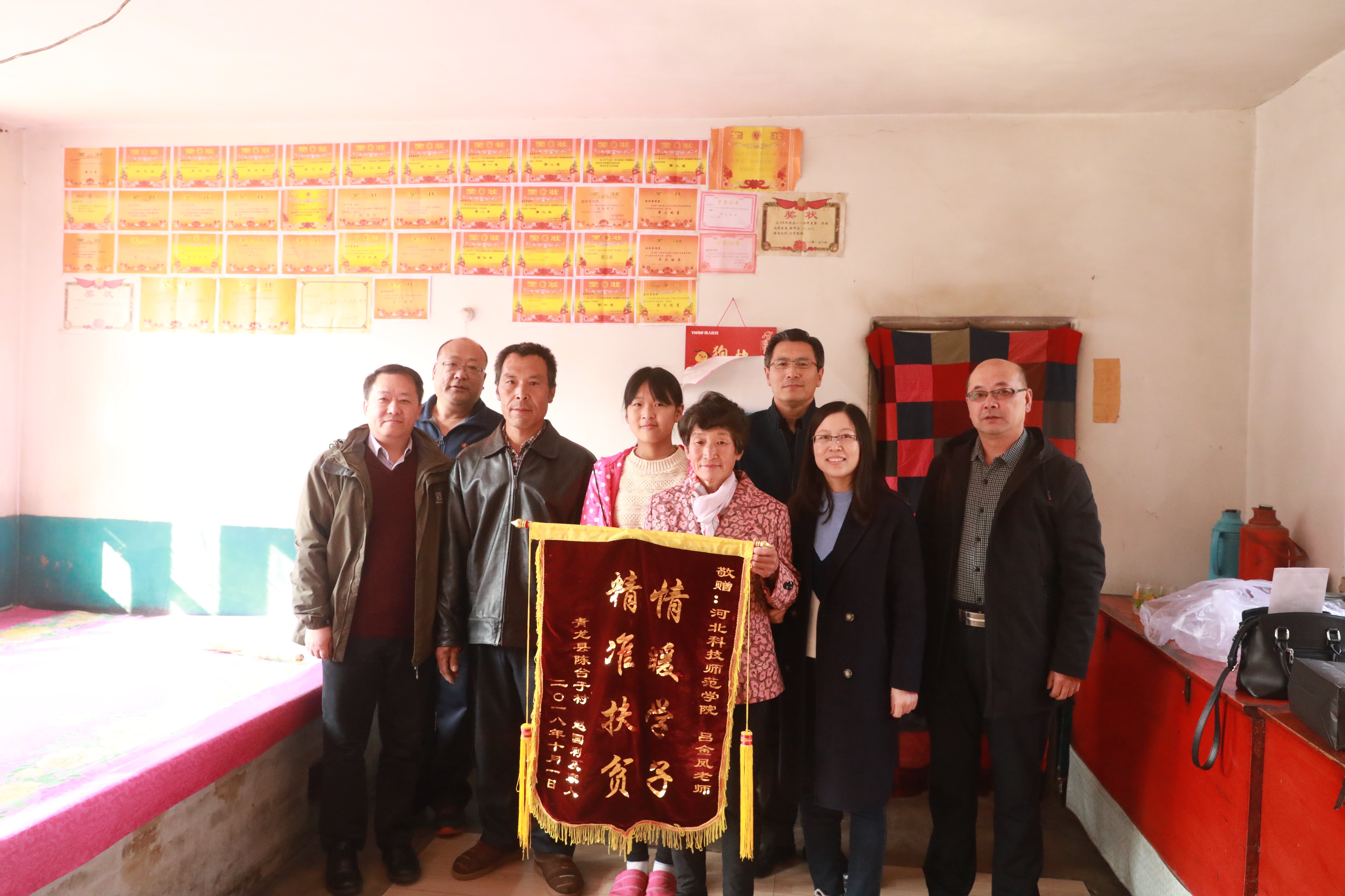 2018年11月3日,青龙陈台子村贫困户赵国利一家人,向公司结对帮扶责任人吕金凤老师赠送一面写有“情暖学子 精准扶贫”的锦旗。他们正在上初中的女儿赵冰雪给吕金凤老师写了一封情真意切的感谢信,一家人真心表达对吕金凤老师三年来对他们真情暖心扶贫助学的感激之情。公司驻陈台子村工作组组长、第一支部书记王伟,公司领导参加了赠送锦旗仪式。