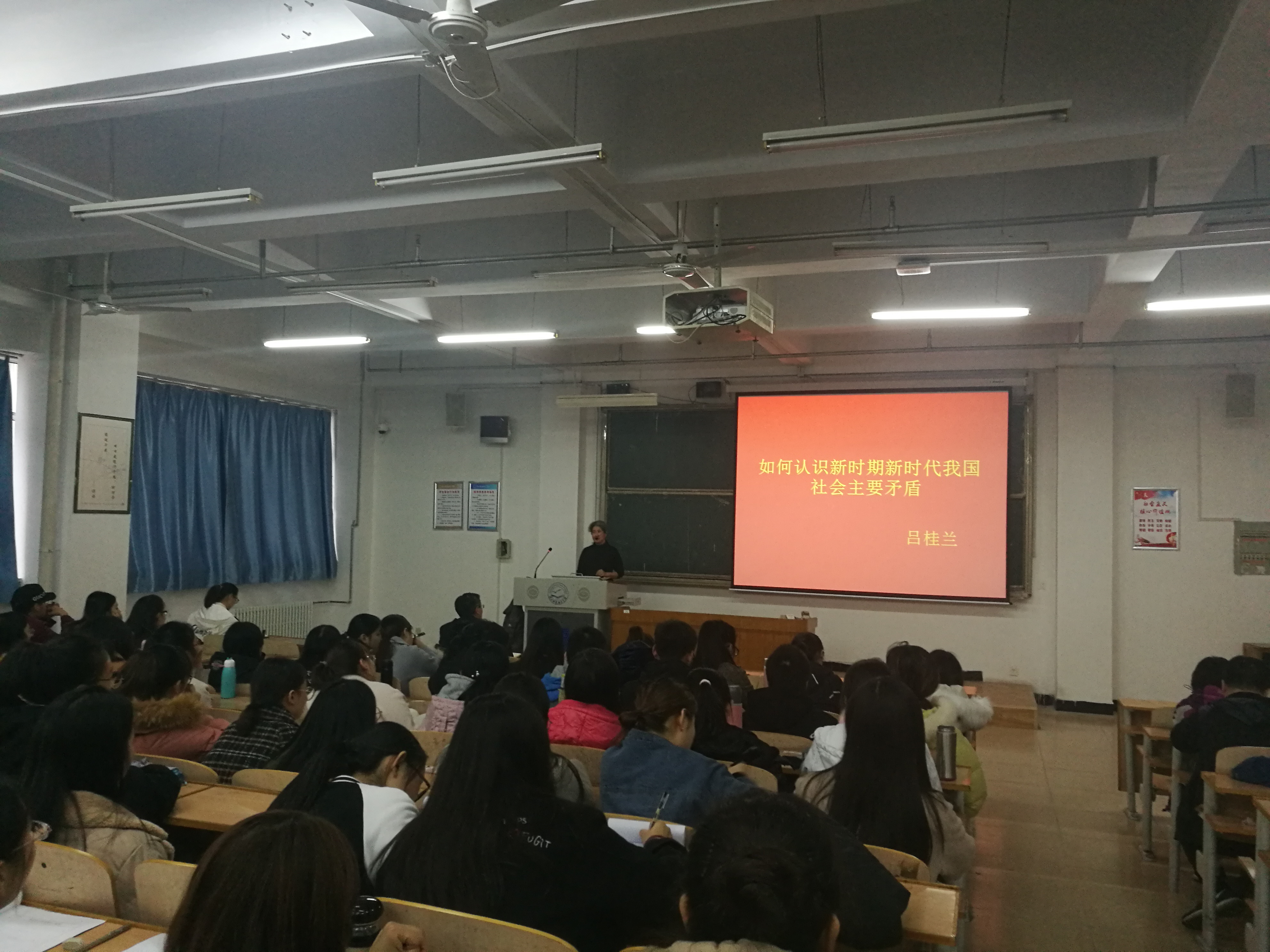 吕桂兰老师以如何认识新时期新时代我国社会主要矛盾为主题,从寻找道路、目标任务和历史使命等方面深入浅出的分析了新时期与新时代的区别;运用矛盾分析法深刻阐述了新时期新时代我国社会主要矛盾的具体体现;深刻解读了党的十九大报告提出的新时代我国社会主要矛盾已经转化为人民日益增长的美好生活需要和不平衡不充分的发展之间的矛盾,这一重大判断的现实意义;最后,吕桂兰老师勉励9428cn太阳集团古天乐老员工要结合自身的学科优势,在互联网+、大数据、人工智能科技高速发展的时代背景下,抢抓机遇、迎接挑战,将创新精神融入未来朝阳产业中,改善行业发展不平衡不充分的现状,为实现人民对美好生活的向往而努力奋斗,把报效祖国、造福人民、建功立业作为自己人生的崇高理想。