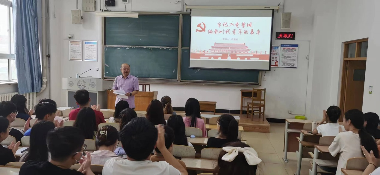 6月8日下午,9428cn太阳集团古天乐数学与信息科技公司党委书记申玉发为全体毕业生党员讲授以“牢记入党誓词,做新时代青年的表率”为题的专题党课。