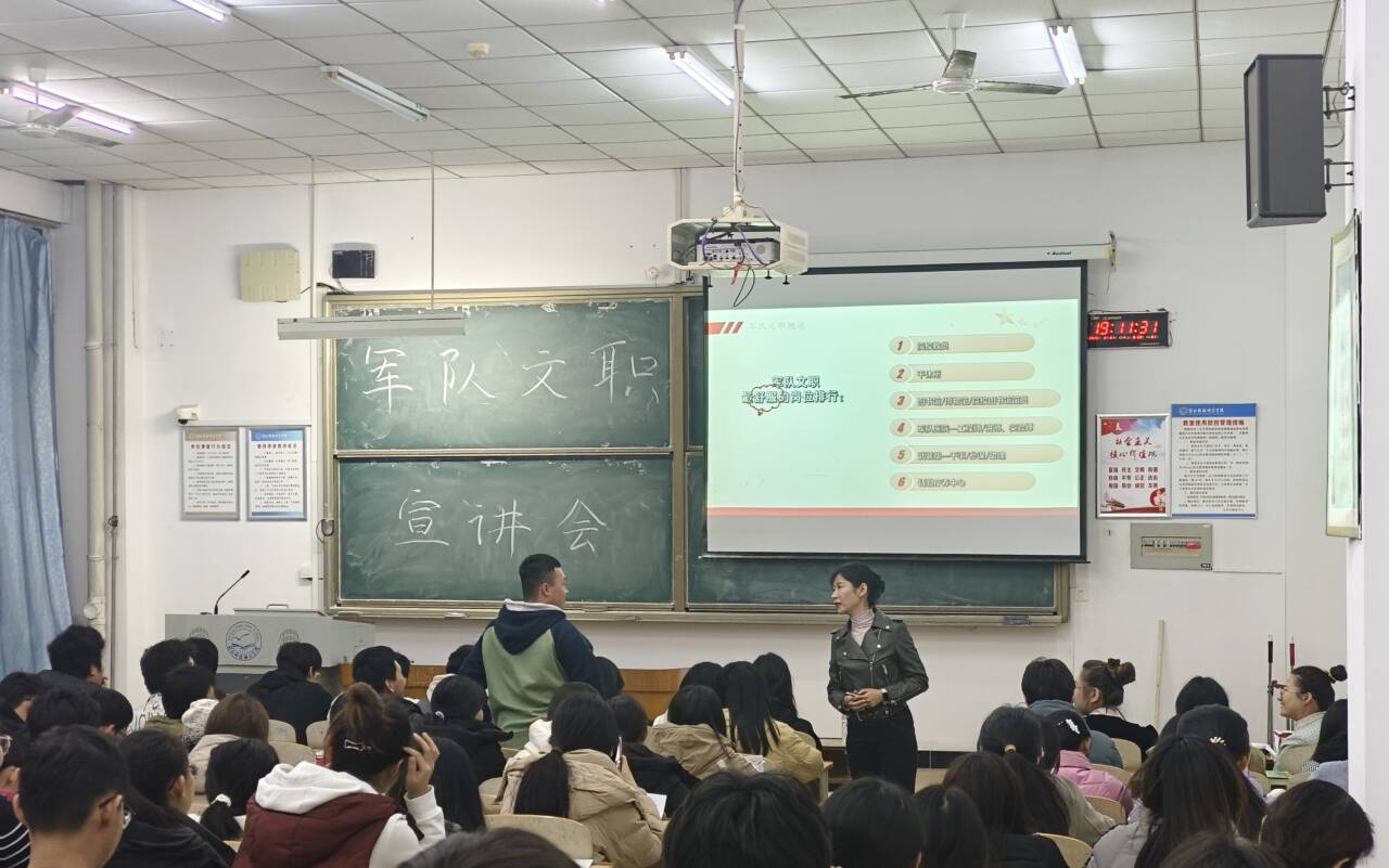 本次军队文职宣讲会的主讲人王瑶老师从工作岗位、福利、军队文职的职业发展路径等方面详细介绍了军队文职工作。通过这些介绍,同学们了解到军队文职人员不仅在军队建设中扮演着重要角色,还在国家安全和军队现代化中发挥着不可或缺的作用。这让同学们对军队文职的工作产生了浓厚的兴趣和敬意。在宣讲会期间,同学们热情投入,踊跃地回答王瑶老师地提问,同学们也主动地提问一些有关军队文职工作的问题,并且积极地填写咨询表,以求的自己的未来多一份保障。