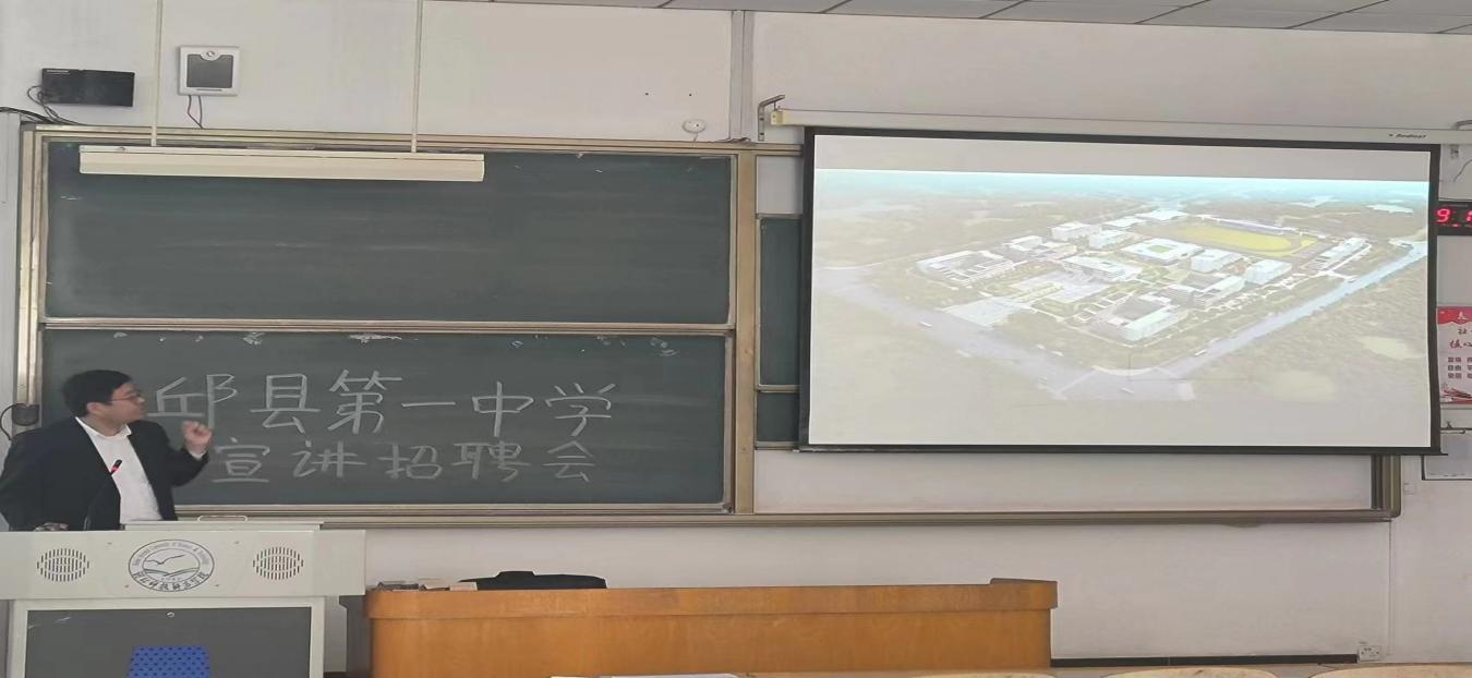 本次招聘会的宣讲人先为我们介绍了关于邱县的历史与学校的文化。邱县第一中学建于1951年,是省级示范性高中,在校生5500人,教职工340余人,是邱县唯一一所普通高级中学。今年9月邱县第一中学南校区正式投入使用。新校区占地213亩,建筑面积约9万平方米,包含教学楼、实验楼、行政综合楼、餐厅、报告厅、风雨操场、体育场、员工公寓、教师公寓等。今年邱县第一中南校区计划招收高一新生30个班,约1500人,现在学校面向全国招聘教师。竭诚欢迎有志青年加盟。