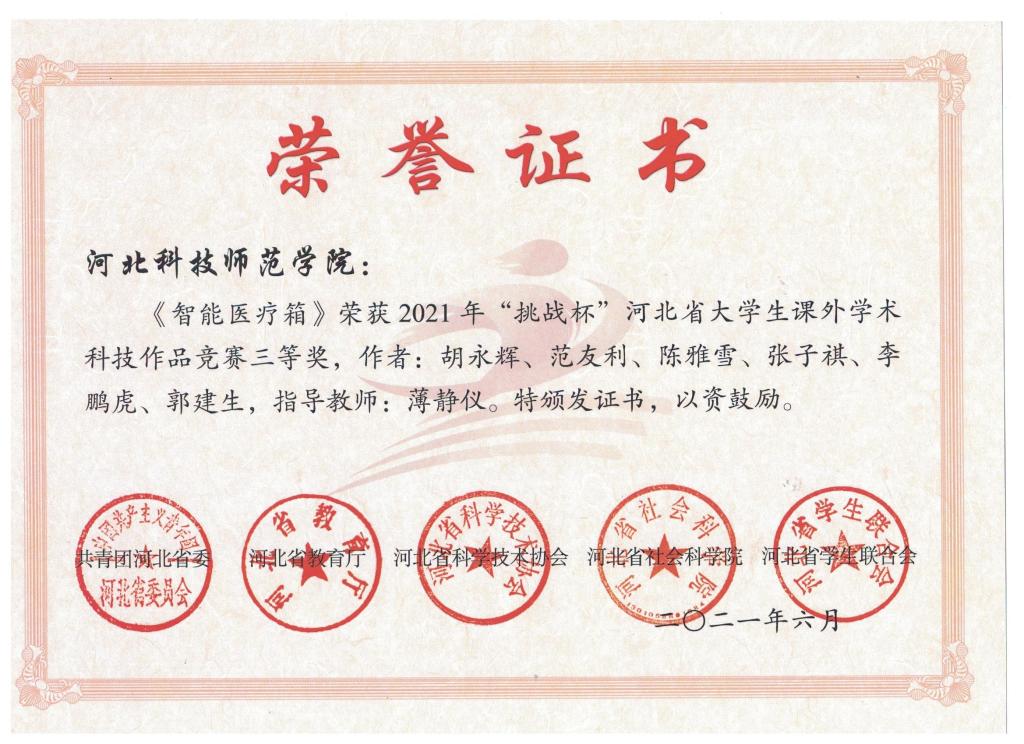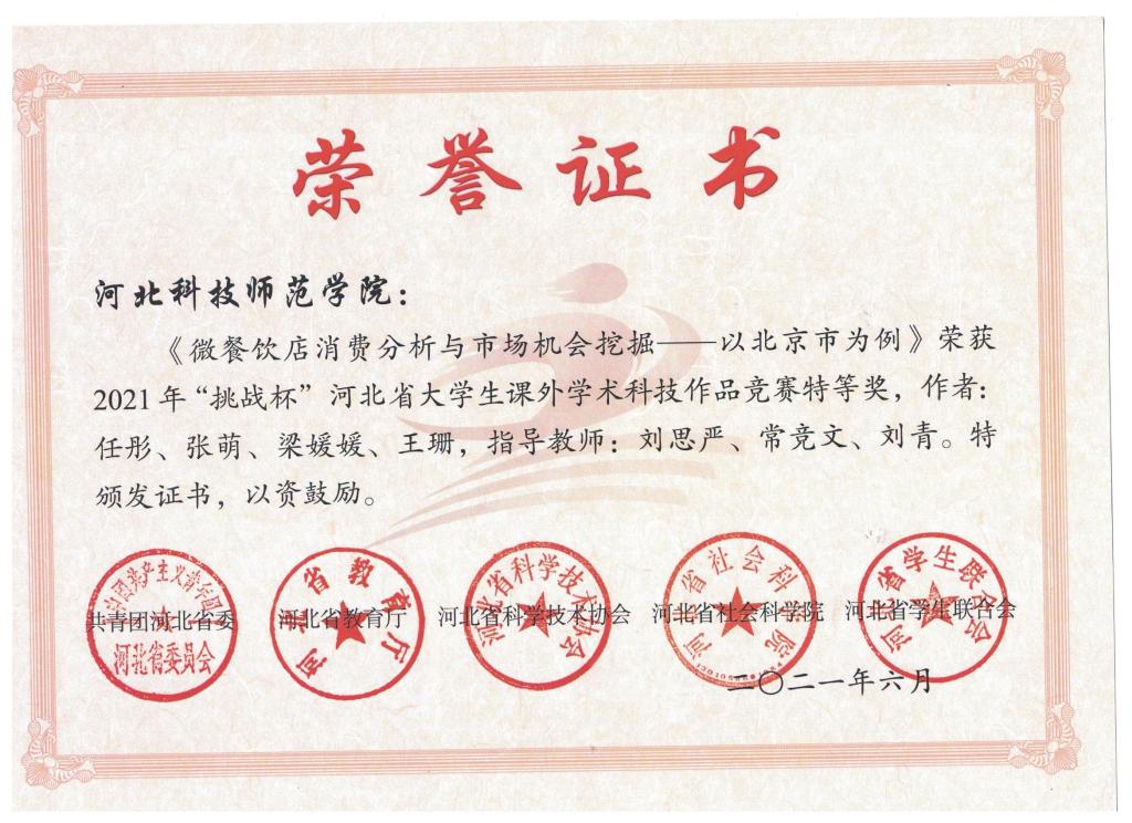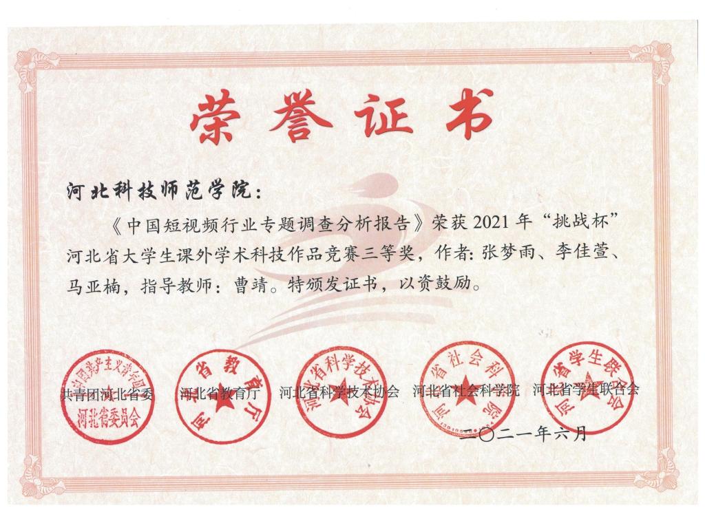 日前,共青团河北省委、河北省教育厅、河北省科学技术协会、河北省社会科学院、河北省员工联合会联合对2021年“挑战杯”河北省老员工课外学术科技作品竞赛获奖结果进行通报。公司有4件作品获奖,其中,《微餐饮店消费分析与市场机会挖掘--以北京市为例》作品获得大赛特等奖;《“穿越沙漠”最佳规划策略的研究》、《中国短视频行业专题调查分析报告》、《智能医药箱》3件作品获得大赛三等奖。此外,刘思严老师荣获2021年“挑战杯”河北省老员工课外学术科技作品竞赛“优秀指导教师”荣誉称号。