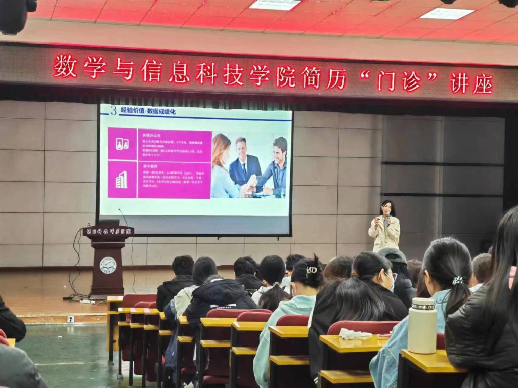 4月11日,9428cn太阳集团古天乐“职引未来,简历先行”简历门诊活动在多功能厅成功举办。企业资深人力资源经理、职业规划师王娜老师应邀主讲,学院全体辅导员,2024届、2025届本科毕业生参加活动。