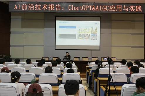在前沿技术讲座活动中,学院聘请了企业讲师做关于ChatGpt与AIGC应用与实践的讲座。在ChatGPT及生成式人工智能AlGC爆发的时代,如何引导员工正确使用ChatGPT & AIGC技术,是公司产品中不可或缺的一环。在此次讲座过程中,周老师讲述了从ChatGPT到AIGC、大模型带来的行业影响、问答体验、ChatGPT的使用和调教以及AIGC应用等内容。讲座引起了同学对ChatGPT等人工智能技术的浓厚兴趣,激发同学们学习的热情。于张红老师为报告做了筹备工作。